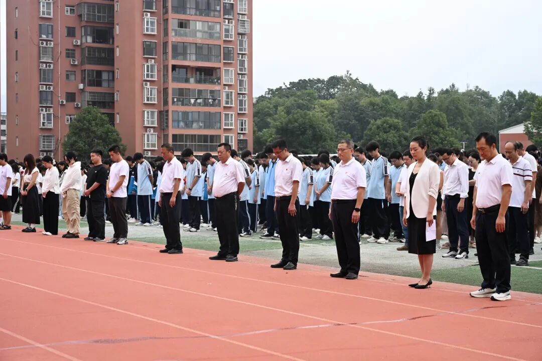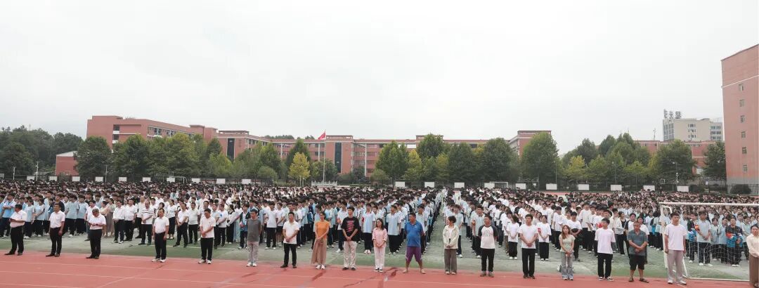 9月18日上午9点45分,县职教中心运动场庄严肃穆。3900余名师生整齐列队,白衣黑裤的教师如史页凝墨,蓝衫皎洁的学子似新荷初绽,在微凉秋风中静候仪式开启,一幅庄重的纪念画卷徐徐铺展。
