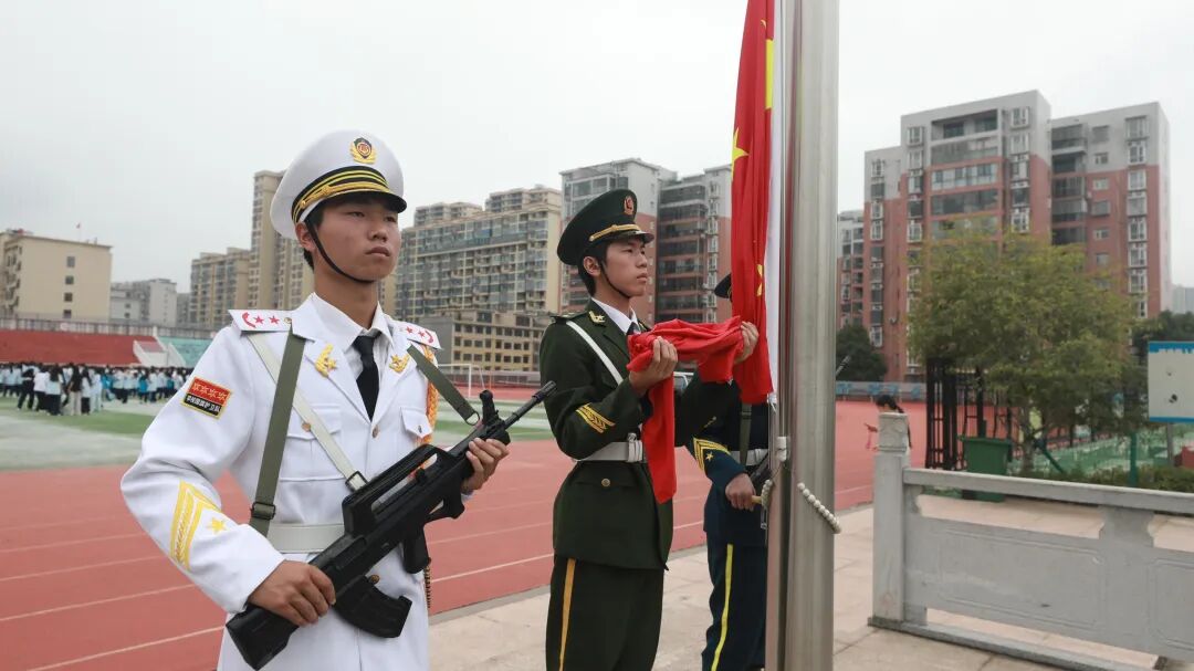 国护队员踏着《义勇军进行曲》的节拍铿锵而行,枪械银光划破凝重的空气。当第一声号音裂空而起,红旗如烈焰翻腾攀升。少年们颌线紧绷,眸光如星;教师们脊梁笔挺,颔首向旗。风掠过旗角发出猎猎声响,与千人同唱的国歌交织,在运动场上空筑起一道无形的精神长城。