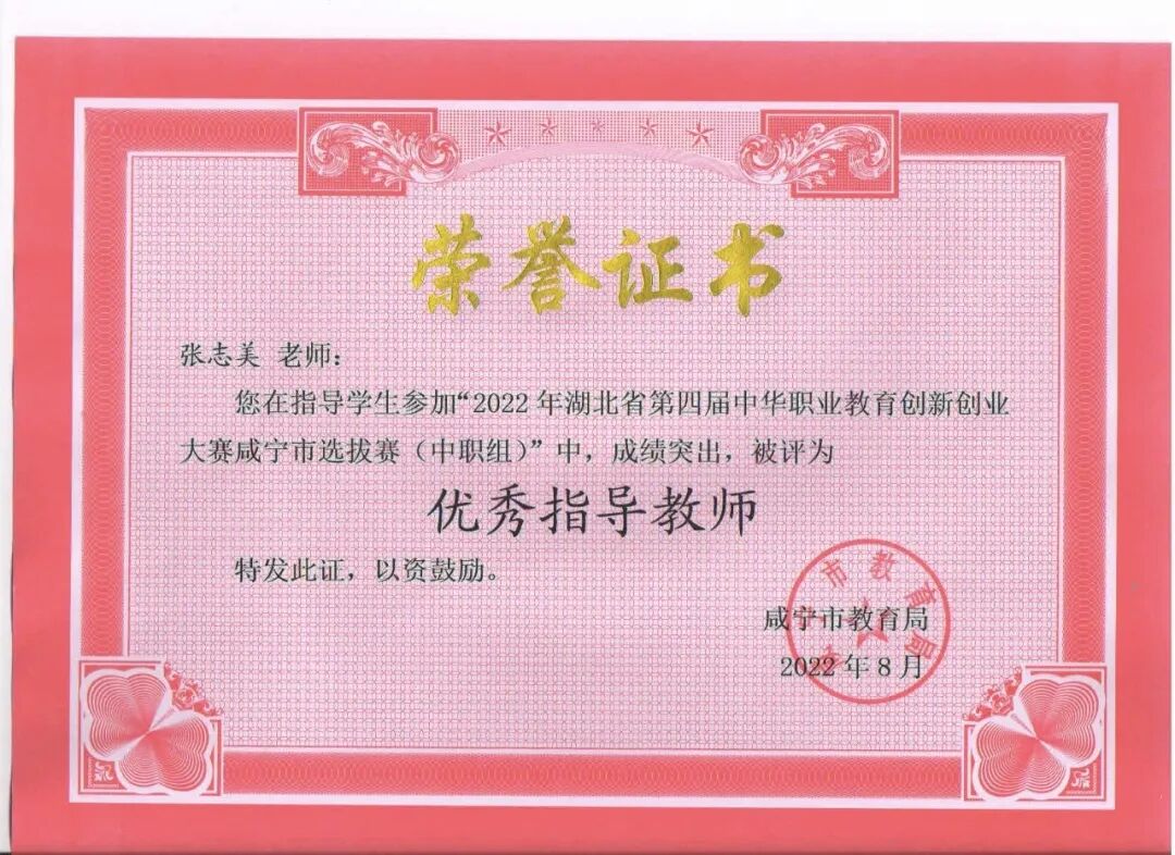 这种精益求精的精神也体现在指导学生竞赛中。2022年,在第四届湖北省中华职业教育创新创业大赛中,她指导的团队《携“手”一生——下楼辅助智能手杖》项目一举夺得省赛金奖、市赛一等奖,她个人也荣获“优秀指导教师”称号。在2022年湖北省职业院校技能大赛中,所指导的学生团队在中职组网络搭建与应用赛项荣获省三等奖和咸宁市一等奖的好成绩。